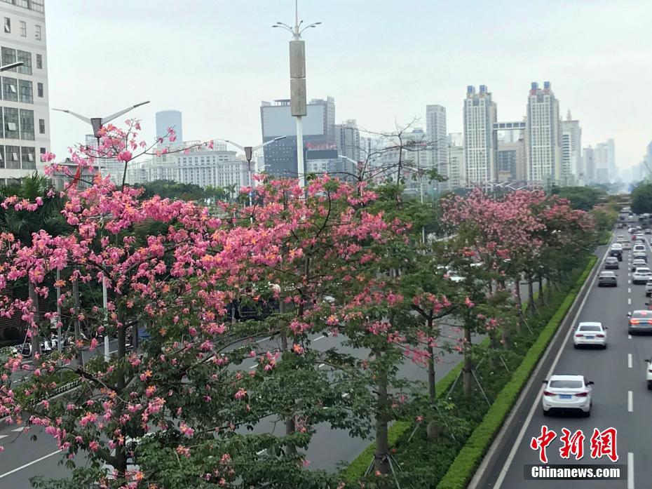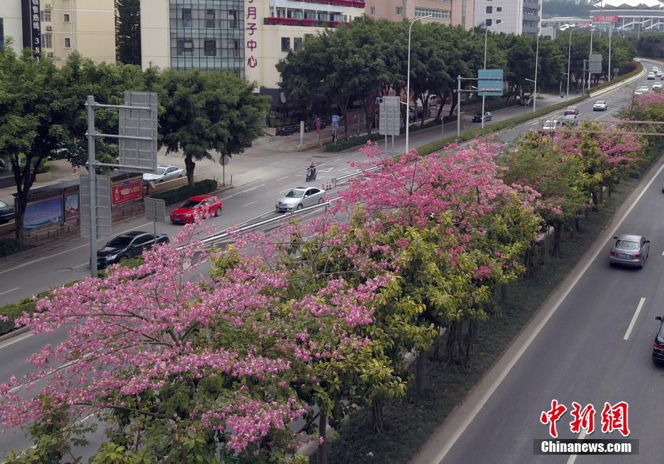 11月18日以来,广西首府南宁市气温一路走低,20日,南宁市最低气温只有14℃。尽管天气寒冷,但南宁市道路、居民小区及公园内依然开满鲜花。美丽异木棉、羊蹄甲及三角梅等鲜花纷纷开放,冬天的南宁被花的海洋淹没,给即将到来的广西壮族自治区60年大庆增添喜色。蒋雪林 摄