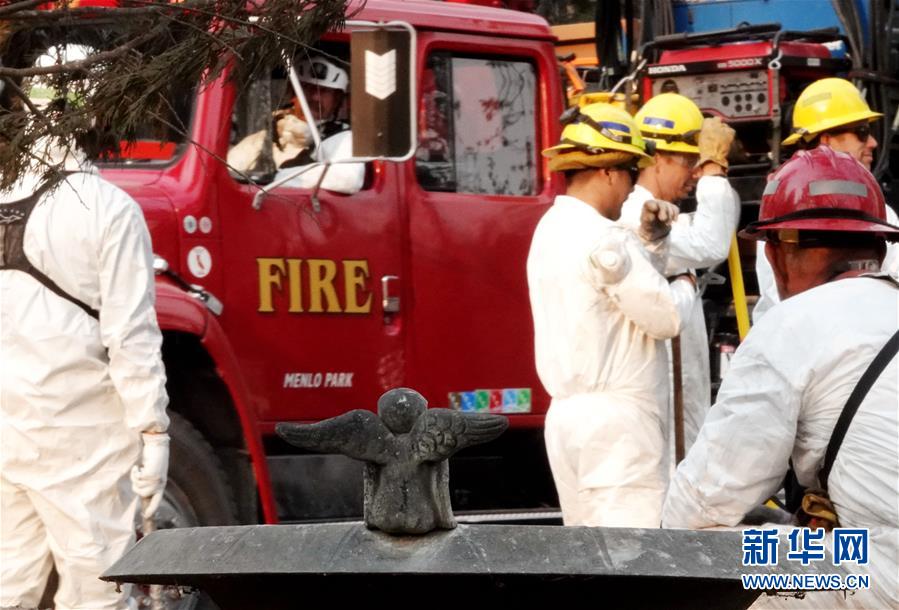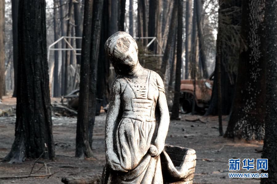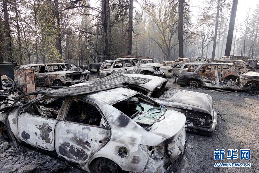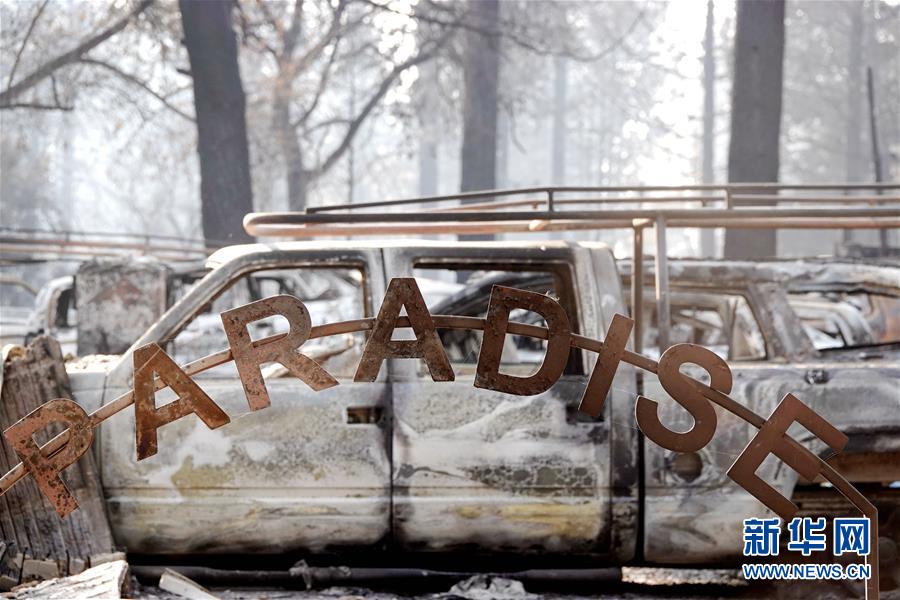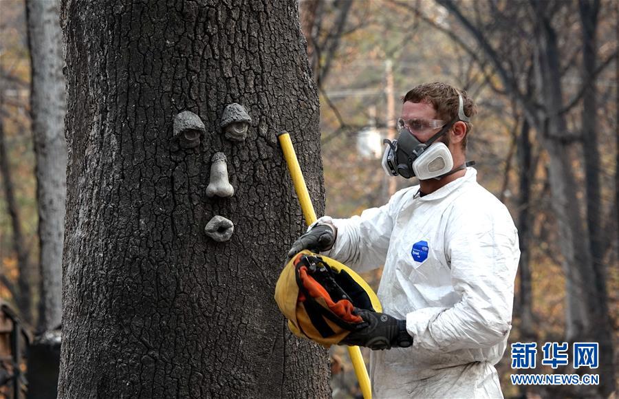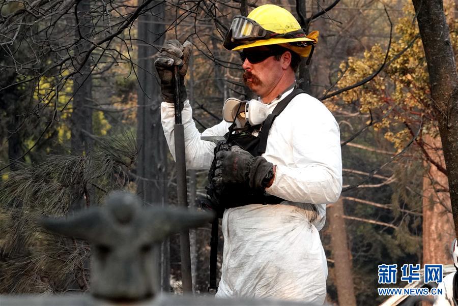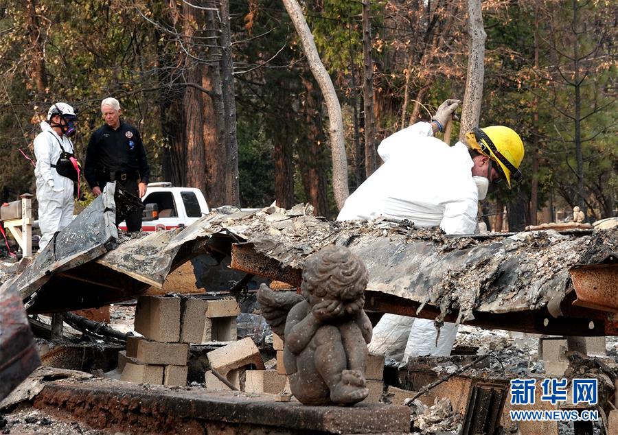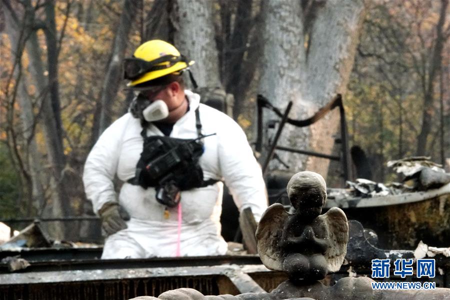 11月19日,在美国加利福尼亚州比尤特县天堂镇,救援人员在山火废墟中工作。比尤特县治安官科里·哈尼19日表示,“坎普”山火致死人数升至79人,另有约700人失踪。