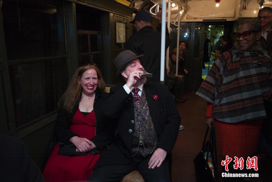 当地时间11月25日,两名乘客穿着复古服装在复古列车中。当日,纽约大都会运输署举行假日怀旧地铁之旅活动,收藏在纽约交通博物馆的8节20世纪初的地铁列车重新驶入曼哈顿地铁系统,乘客只需正常刷地铁卡即可重温上世纪初在曼哈顿搭乘地铁的情景。众多纽约客穿着复古服装参加活动,复古列车中洋溢着浓厚的历史氛围。 中新社记者 廖攀 摄