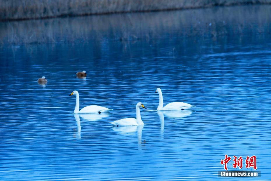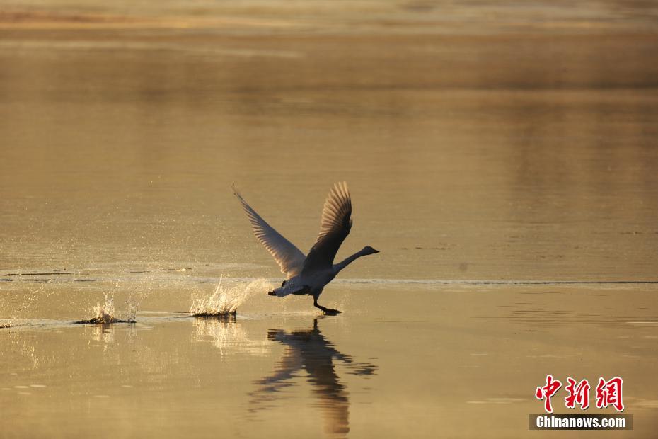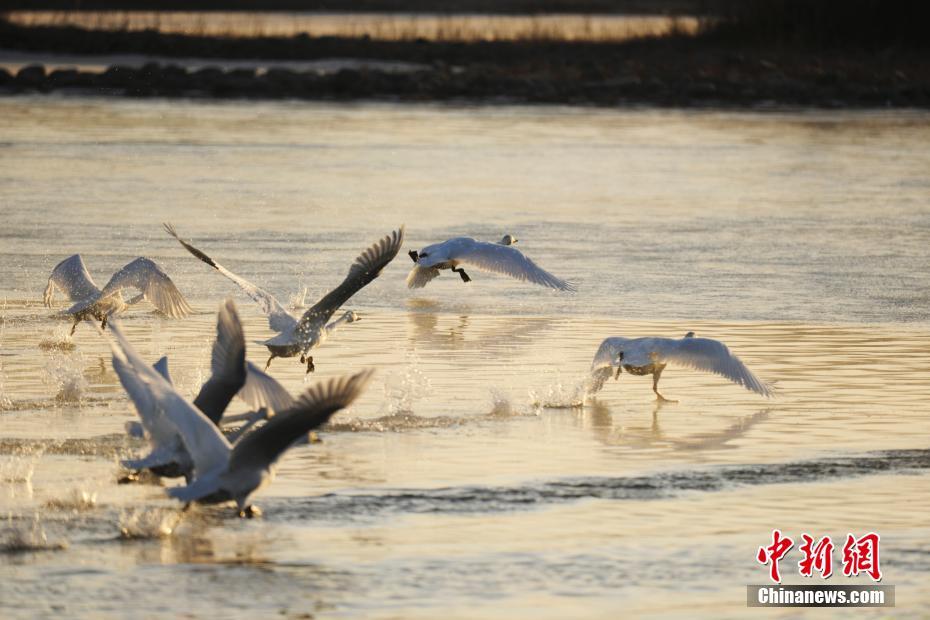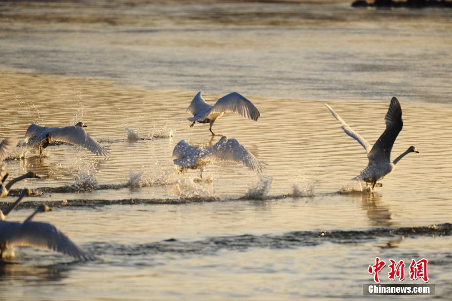 近日,青海省贵德县黄河湿地公园内,成群结队的天鹅群在岸边起舞嬉戏。今年,数百只天鹅迁徙到青海省贵德县黄河湿地越冬,为冬季的黄河增添了一份美丽与灵动。赵时春 摄