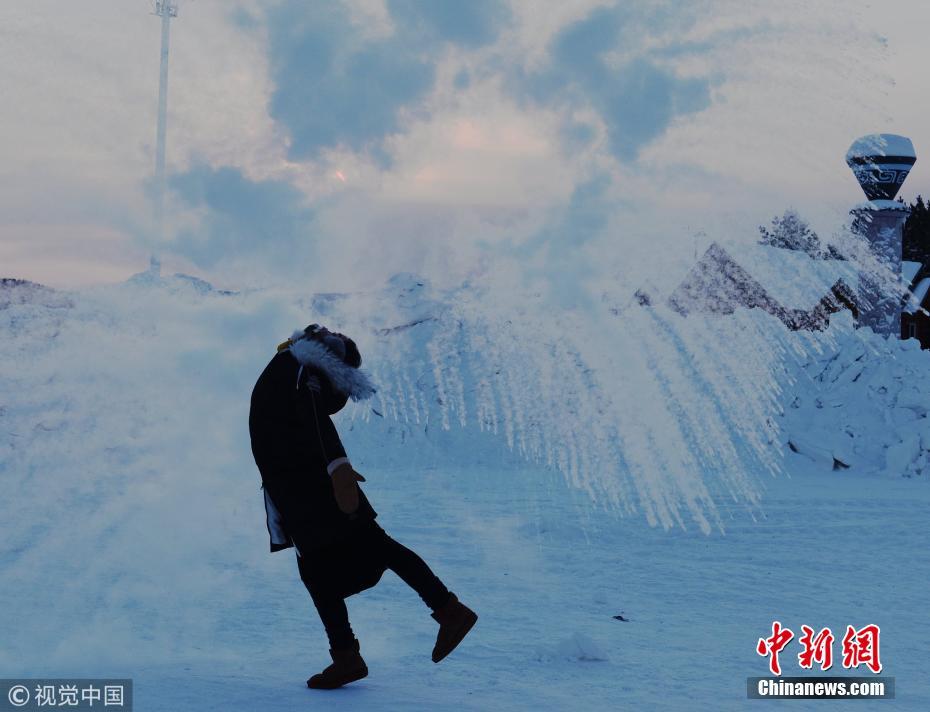 位于祖国最北端的黑龙江大兴安岭漠河市迎来极寒天气,最低气温达零下39摄氏度,来自全国各地的游客在极寒天气里玩起了泼水成冰游戏,享受冰天雪地的欢乐。图为12月8日,游客在漠河玩起了泼水成冰游戏。褚福超 摄 图片来源:视觉中国