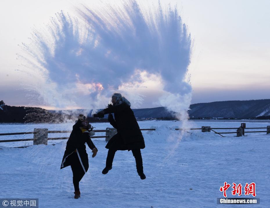 黑龙江漠河冰天雪地 游客享受泼水成冰之乐