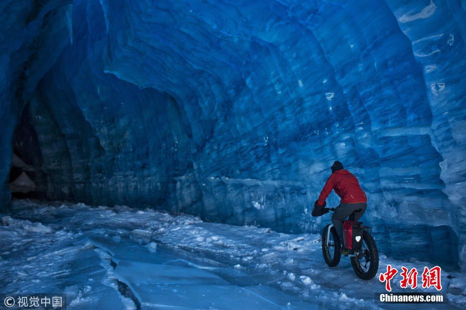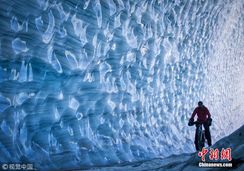 男子骑车横跨阿拉斯加冰川 穿越30米高蓝色冰洞
