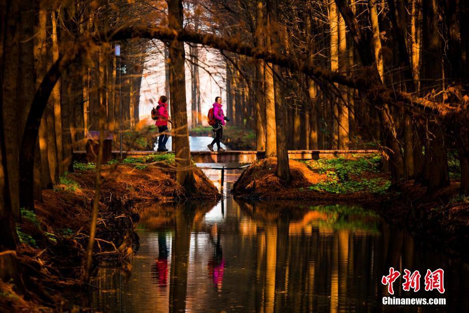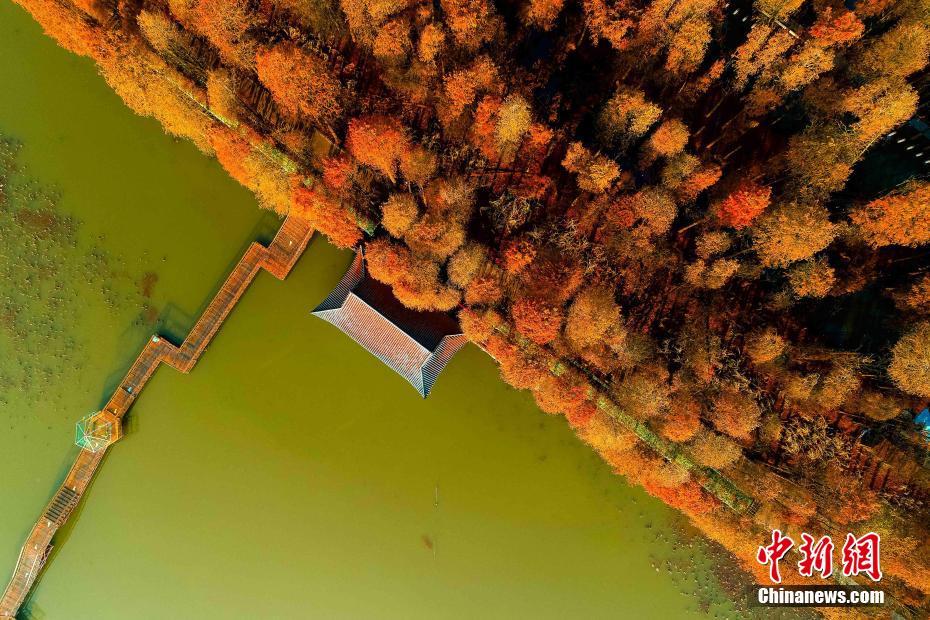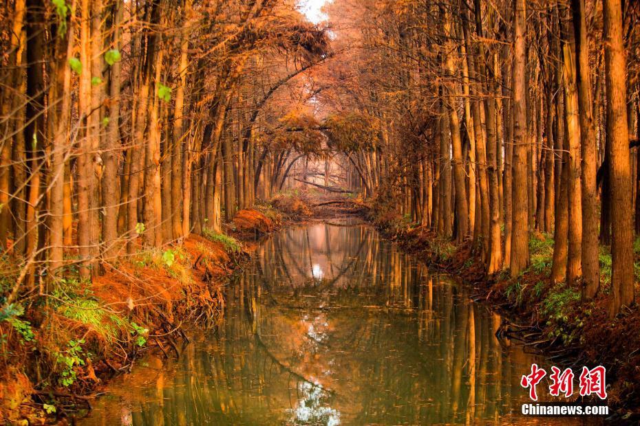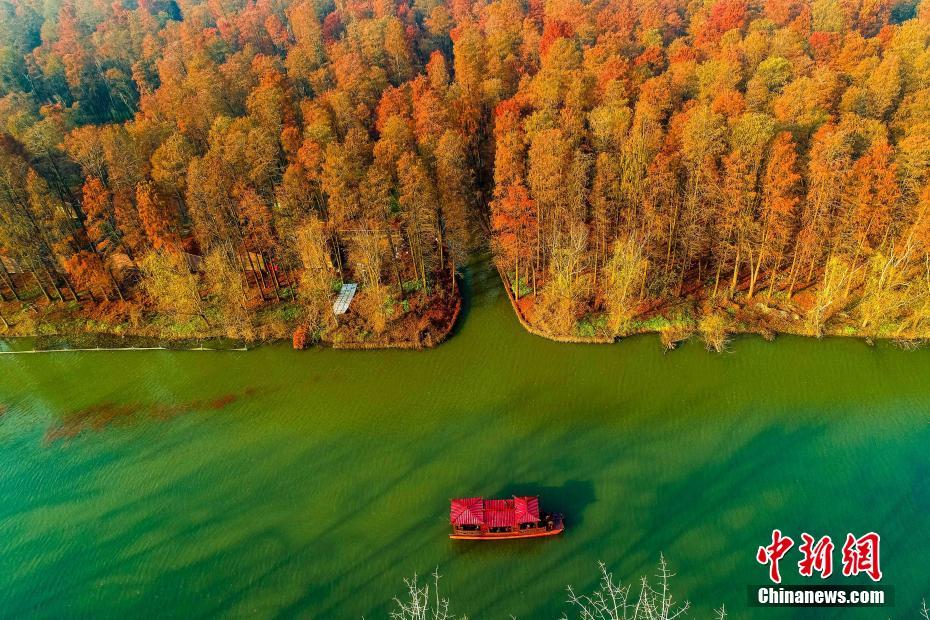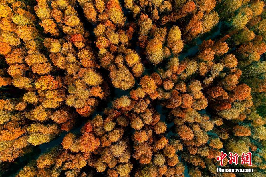 2018年12月23日航拍的泰州兴化李中水上森林景色。进入冬季,李中水上森林景区层林尽染、云雾缭绕、色彩斑斓,美如画卷。李中水上森林景区占地面积2000亩,林木蓄积量1.25万立方米,形成“林中有水、水中有鱼、林内有鸟、河流回环、水杉林立”的生态湿地景观。中新社发 汤德宏 摄 图片来源:CNSPHOTO