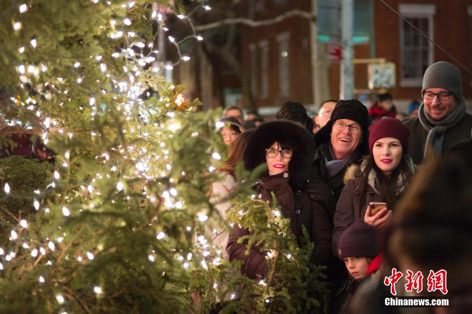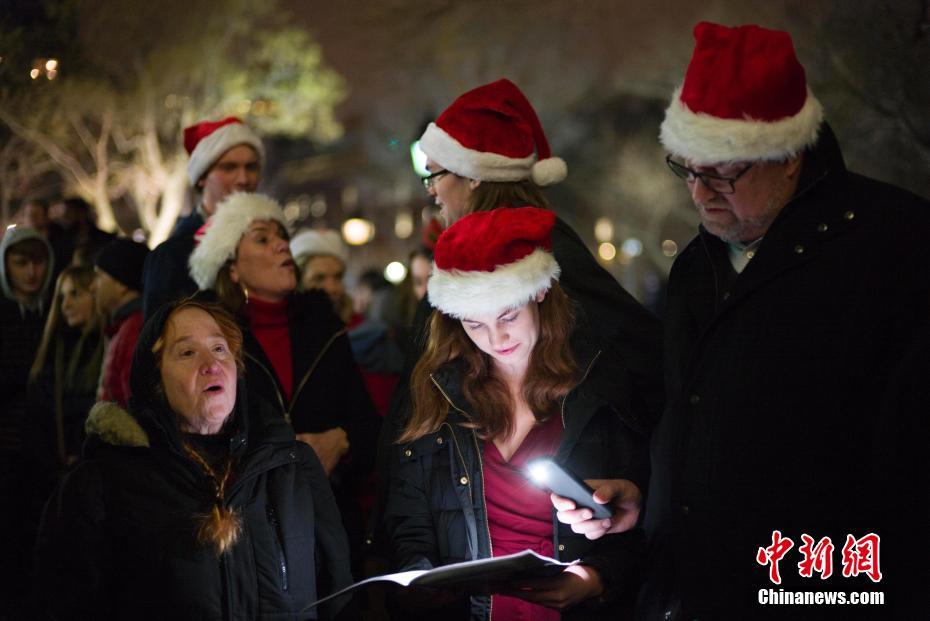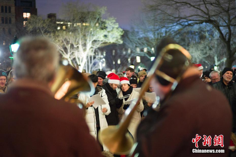 当地时间12月24日,民众在平安夜聚集纽约华盛顿广场共唱圣诞颂歌,上千人围绕在圣诞树周围共唱近30首圣诞歌曲。中新社记者 廖攀 摄