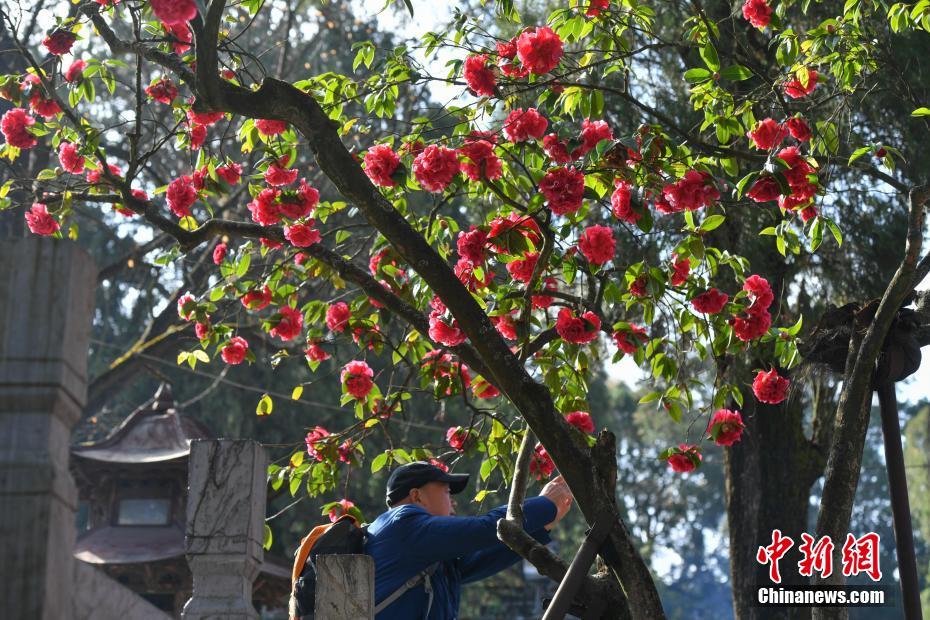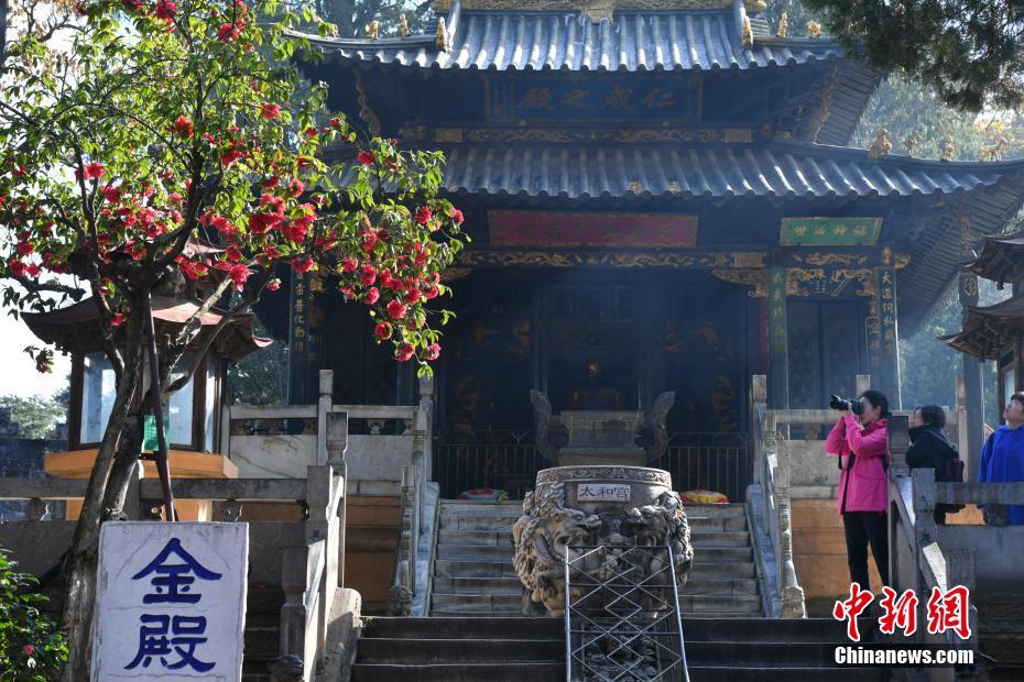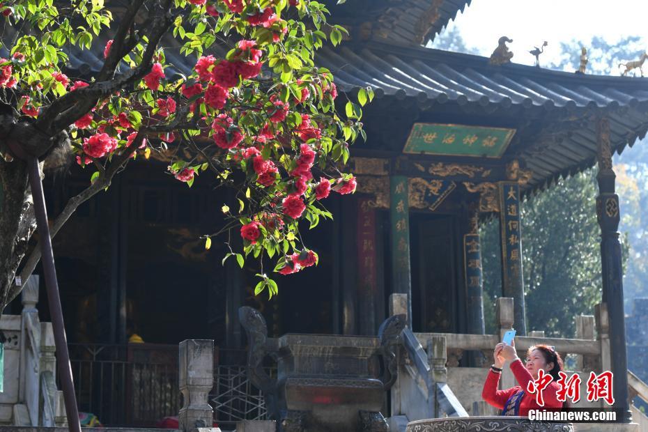 1月10日,昆明金殿前的一株古山茶花盛开吸引游客拍照。据昆明市金殿名胜区负责人介绍,金殿旁的古茶树“殿前红”已经有400多年的历史,它一年长叶、一年长花,今年花开似锦,已经有上百朵之多。中新社记者 任东 摄