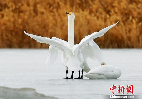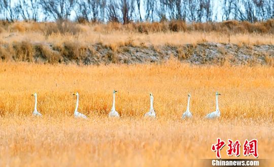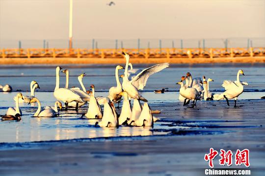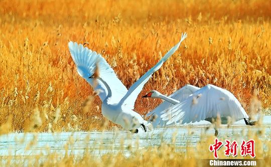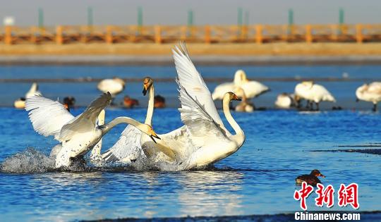 生态趋好 数百只天鹅在青海省格尔木湿地翩翩起舞