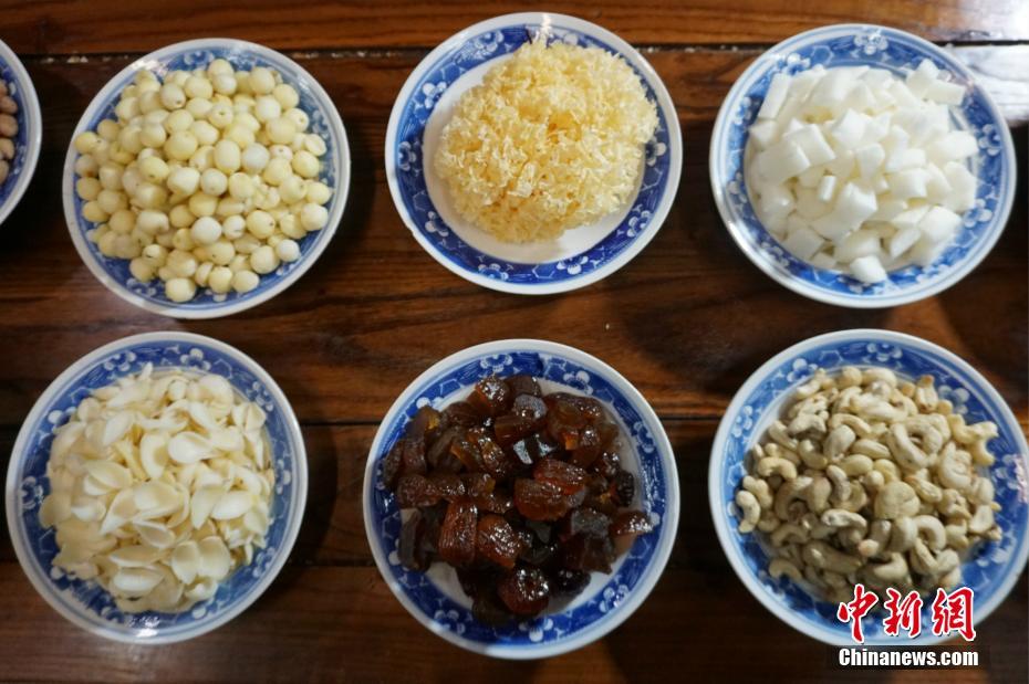 1月13日,河南嵩山少林寺僧众在少林药局门口施粥,来自全国各地的游客和信众排起长队,领取“少林五行腊八粥”,以求“沾福气”、讨吉利。腊八施粥是河南嵩山少林寺千百年的传统,2008年,少林药局的师父们参照禅医古例,复原“少林五行腊八粥”,其配方以黄豆、红豆、黑豆、绿豆、芸豆这5种颜色的“五行豆”为主料,配以其他20余种食材为辅料以及少林药局秘方药汁,熬制3个多小时而成,具有养胃暖身、驱寒健脾的功效。图为河南嵩山少林寺方丈释永信为游客施腊八粥。韩章云 摄