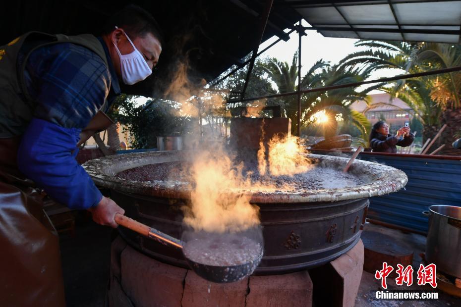 1月13日,昆明宝华寺用巨型铜锅熬制腊八粥。当日是中国传统节日“腊八节”,昆明宝华寺向民众派发腊八粥,送福送吉祥。中新社记者 任东 摄