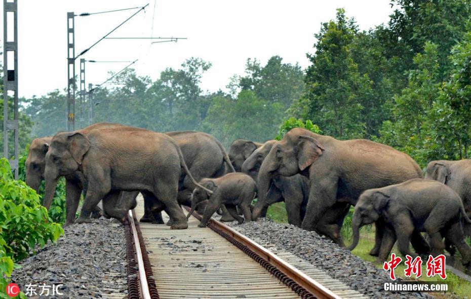 印度毗湿奴布尔,一头大象妈妈领着宝宝横穿铁轨。据悉,这些大象“闯入”铁轨并非是因为迷路乱闯,而是这条铁路硬生生横穿它们的栖息地。