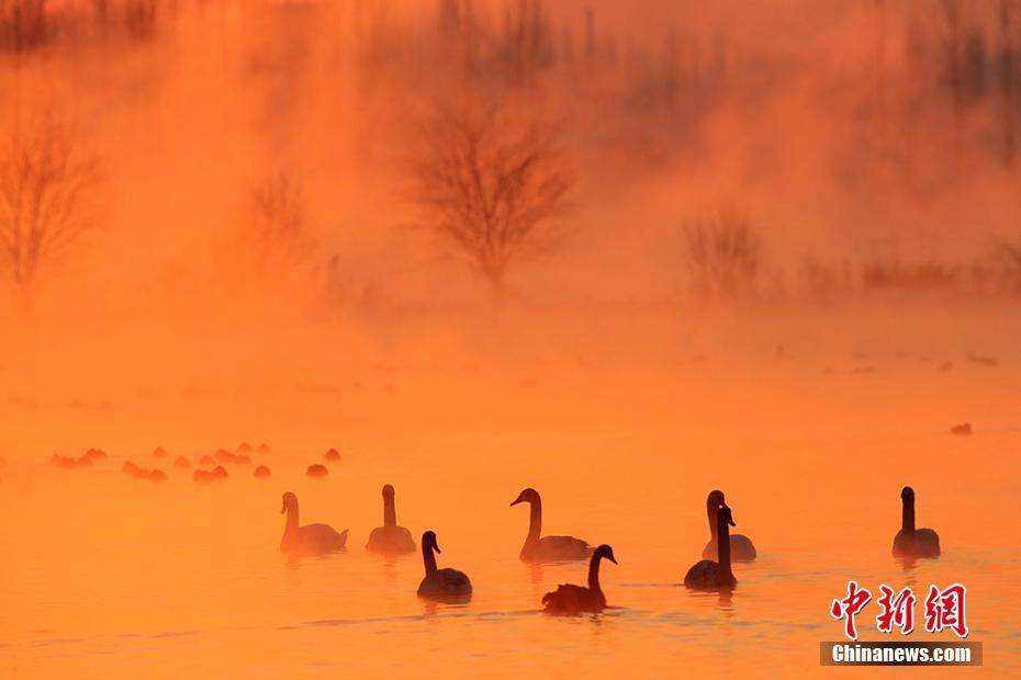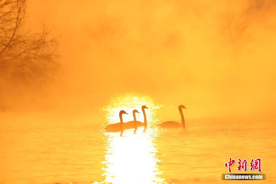 新疆天鹅泉缥缈雾气中天鹅起舞