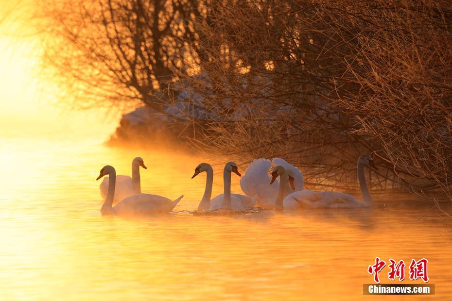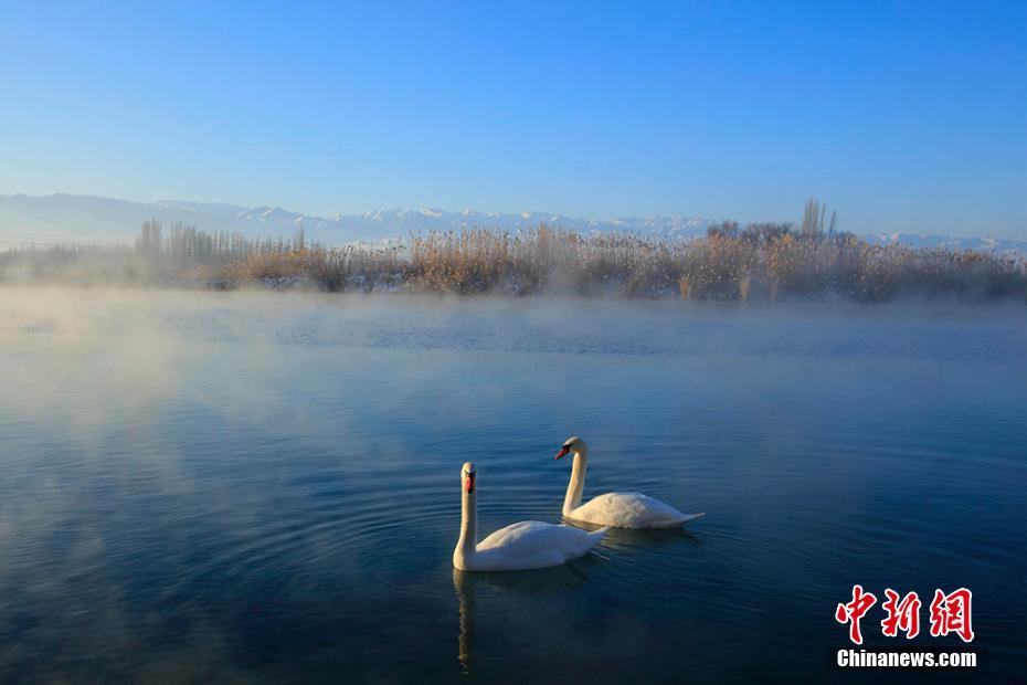 近日,新疆伊宁县英塔木乡的天鹅泉湿地,上百只天鹅在雾气中“起舞”。每年都会有200余只天鹅在这里的湿地过冬,其中90%为疣鼻天鹅。文/耿丹丹 图/崔明浩