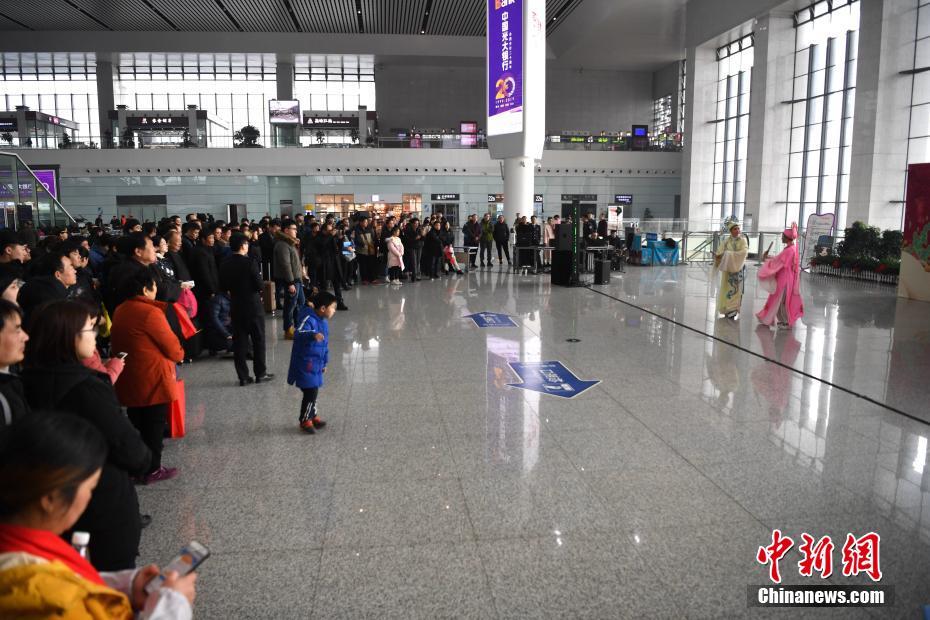 1月21日,2019年春运大幕开启,安徽省合肥市高铁南站邀请安徽省黄梅戏剧院的演员来到候车室,为候车的旅客表演黄梅戏节目。图为黄梅戏演员表演经典剧目。韩苏原 摄