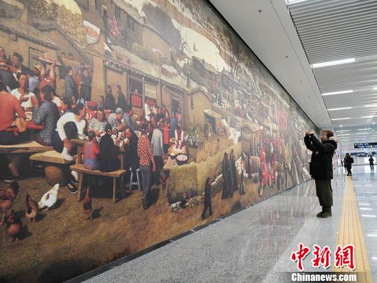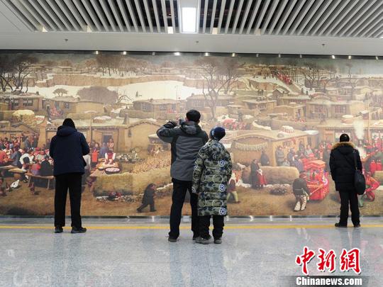 村过年等生活场景的巨幅壁画吸引过往旅客驻足拍照。这幅壁画长约23米,高约3.5米,由不同的东北农村生活场景画面组成,细节惟妙惟肖,极富感染力。