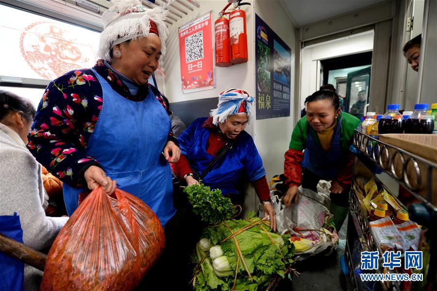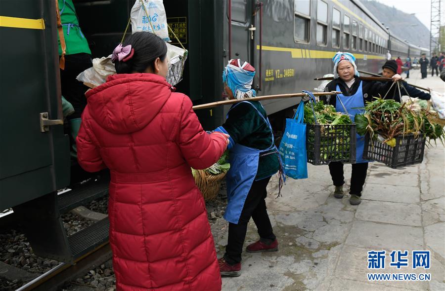 由贵州玉屏开往贵阳的5639次列车是辆绿皮“慢火车”。沿途群众每天挑着箩筐上车,将自家出产的农作物带到贵阳、凯里等地贩卖,再坐着火车把生产资料和日用品带回家。时间一长,不少乘客直接在列车上买卖货物。春节将至,蔬菜水果等农产品交易较往日更加红火,列车上的“年货市场”洋溢着浓浓年味。 新华社发(许毅 摄)