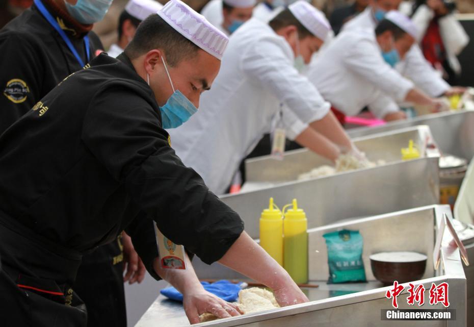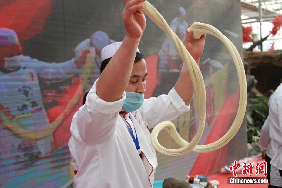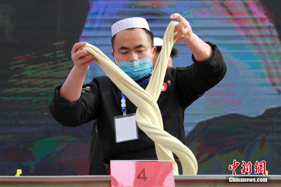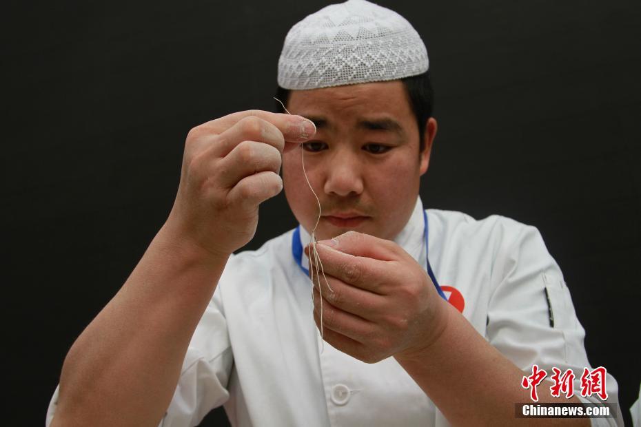 1月29日,选手展示毛细拉面技艺。当日,中国拉面精英争霸赛在青海省化隆回族自治县开赛,来自全国的68个团队的150余位选手参加比赛。比赛现场,选手分别展示了毛细、二细、宽面等拉面制作技艺,赢得观众阵阵喝彩。中新社记者 李培源 摄