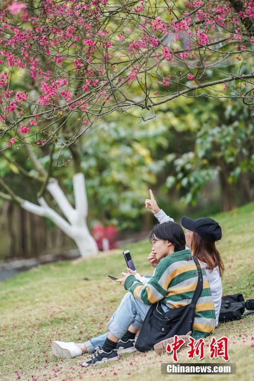 1月30日,广西南宁一公园的“樱花谷”内,大片红樱花已进入花期,市民和游客趁着晴好天气前来赏花。中新社记者 陈冠言 摄