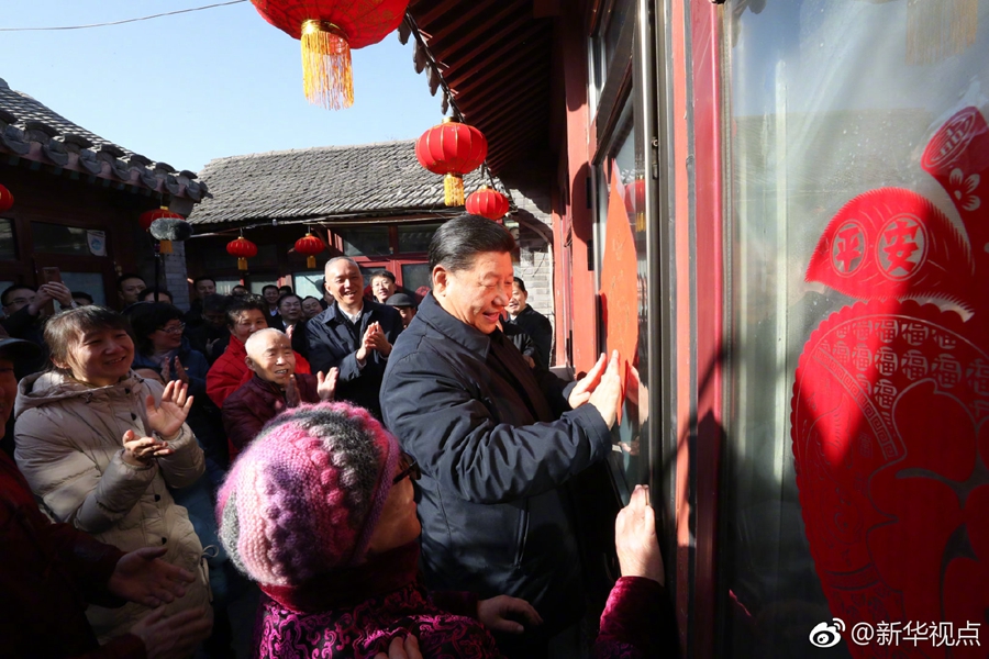 2月1日上午,习近平来到北京前门东区,沿草厂四条胡同步行察看街巷风貌,走进居民家中看望慰问,了解居民生活情况,与群众一起包饺子、拉家常,并向大家致以新春祝福。 记者张晓松、谢环驰、鞠鹏 图片来源: 新华社“新华视点”微博