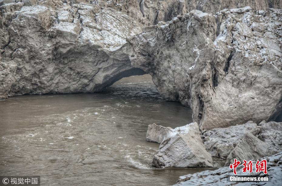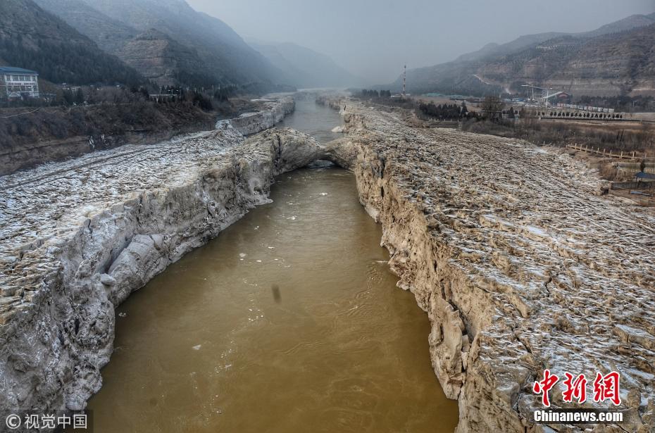 2月15日消息,连日来,由于受持续低温影响,山西临汾黄河壶口瀑布被大量流凌冰封,上游冰凌涌入壶口后,在十里龙槽内受阻不断堆砌抬升河面,“筑”成了难得一见的联通晋陕大峡谷的天然冰桥。图片来源:视觉中国