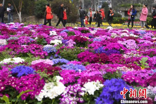 2月15日,重庆市江北区观音桥步行街上,五颜六色的鲜花盛开显得春意浓厚