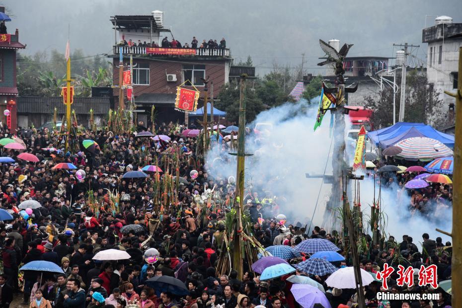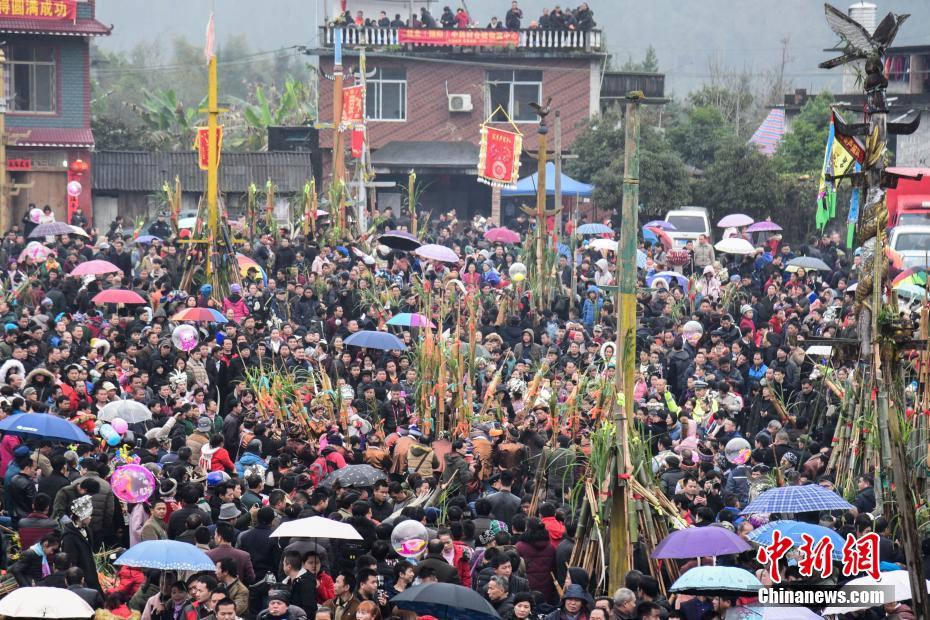 2月20日正月十六,是广西柳州市融水苗族自治县香粉乡的传统节日“正月十六古龙坡会”。当天的“芦笙比响”比赛上,37个参赛队以一对一的形式进行比赛,裁判在300米外的山坡上根据听响度决定胜负,并举旗示意。本次比赛每队有选手40人左右,至少1500名芦笙选手参赛,比赛吸引当地苗、瑶、侗、壮等至少1万名各族群众前来观看。王以照 摄