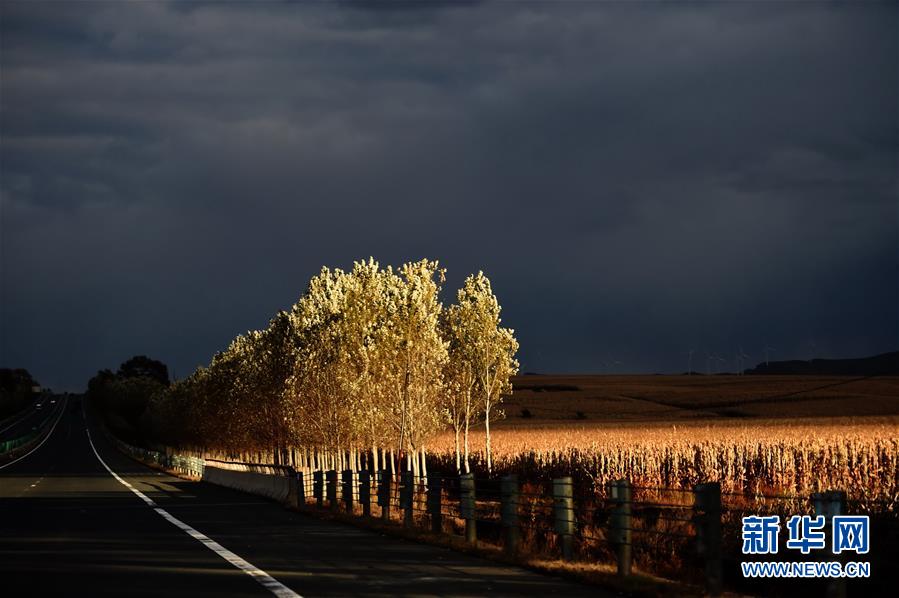 阳光为哈同高速公路附近的树木和庄稼镀上一层金色(10月9日摄)。秋雨过后,驾车行驶在黑龙江省的哈同高速公路上,仿佛置身于“梦幻之旅”。周边草木金黄,山色旖旎,浓重的积雨云化为天幕,雨后的阳光为自然绘就金秋水彩图。新华社记者 王建威 摄