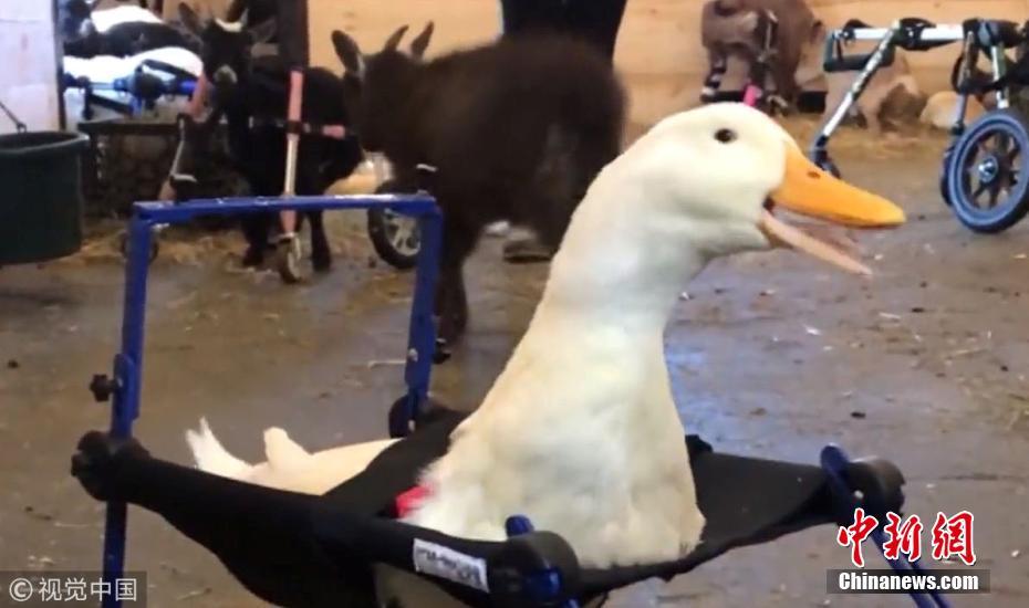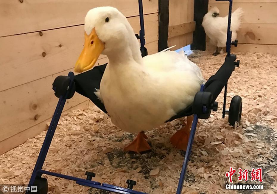 美国新泽西州一只被收养的小鸭子Merlin由于天生跛脚不能走路,一家公司获得联络后帮小鸭子Merlin设计了一款微型轮椅,Merlin进入轮椅后学会了走路,开心得呱呱叫个不停。图片来源:视觉中国